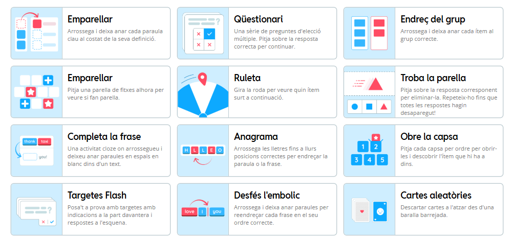 - Recursos lúdics per treballar terminologia, classificacions o processos.